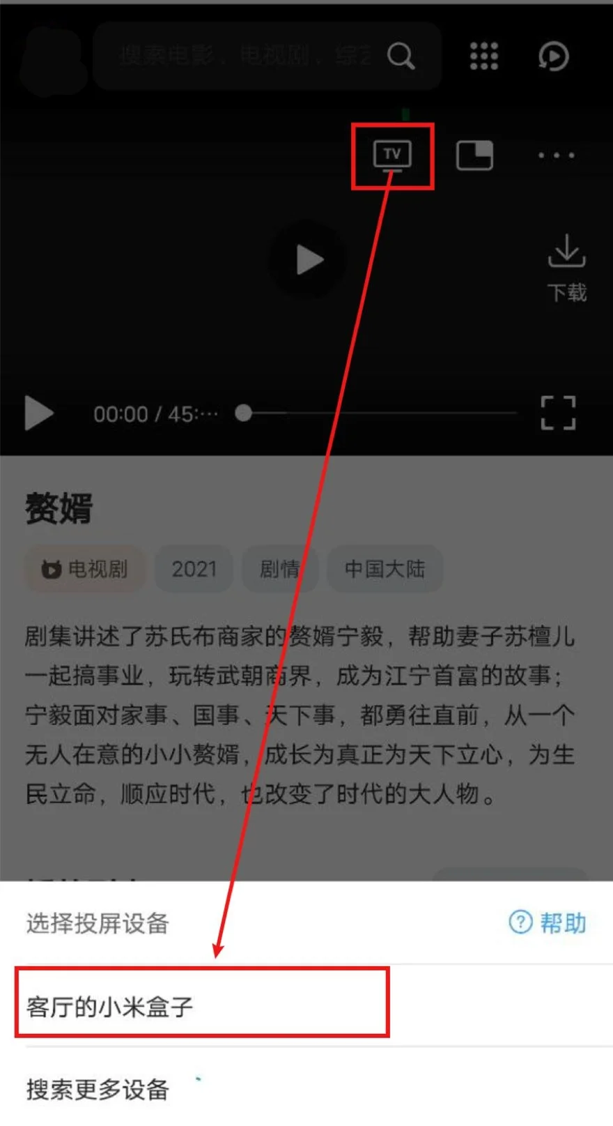 打开QQ浏览器(会接管网页播放器)->打开免费短视频分享大全 ->播放视频->选中投屏图标->等待搜寻出智能电视/电视盒子->选中,即可投屏。